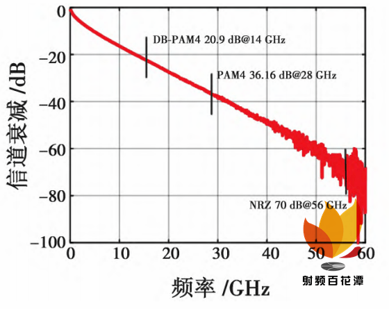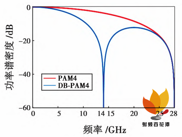 当前主流的调制方式为 NRZ 与 PAM4 调制,NRZ 调制使用高低电平“0”和“1”传输信号,NRZ 调制 1UI 只能传输 1 bit 的“0”或“1”,而 PAM-4 调制则采用 4 个电平“0”,“1”,“2”,“3”( 对应二进制编码为“00”,“01”,“10”,“11”) ,在 1UI 的时间内能传输 2 bit 的信息。相比于 NRZ 调制,PAM4 实现了加倍的数据传输速率,并且在相同速率下,PAM4 的奈奎斯特频率是 NRZ 的一半,使得信号遭受的信道损耗大幅减少。然而随着数据率的飞速发展,信道损耗问题越来越严重,制约了 NRZ调制在 100 Gibit /s 以上高速串口中的应用。在这种情况下,PAM4 逐渐取代 NRZ,其奈奎斯特频率是 NRZ 的一半,成为超高速串口的主流调制方式。而 Duo-binaryPAM4 编码在 PAM4 的基础上,其奈奎斯特频率更是PAM4 的一半,如图 2 所示( 112 Gibit /s Duo-binary PAM4信号的奈奎斯特频率为14 GHz,而 PAM4 信号为 28 GHz,NRZ 信号为56 GHz) ,这带来了以下好处: 1) 使得信号遭受的信道损耗大幅减少,56 Gibit /s NRZ 信号在奈奎斯特频率处的损耗高达 70 dB,PAM4 信号降低为 36. 16dB,而 DB-PAM4 信号降低到了 20. 9 dB,如图 3 所示; 2)信号接收端采用同样的采样率可以获得更多的采样点,数据精度提高。