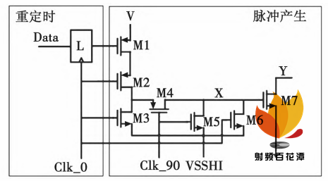 高速的合路器设计是 SerDes 发射机设计的关键,合路器必须要提供充足的时序裕度以保证时序的正确性。传统的 1 /2 速架构合路器留给数据建立和保持的时间只有 1UI,当数据率达到 100 Gibit /s 时,1UI仅为 10 ps,为了扩展时序裕度,设计了基于 4∶ 1 合路器的 1 /4 速架构,合路器的结构如图 5 所示。其时钟频率是输出频率 56 Gibit /s 的 1 /4 即 14 GHz。每个脉冲产生单元在 2 个相差 90°相位且周期是 4UI 宽度周期的时钟驱动下产生 1UI 的数据输出脉冲。这 4 个相同的脉冲产生单元然后在流水线 路高速的数据流输出。